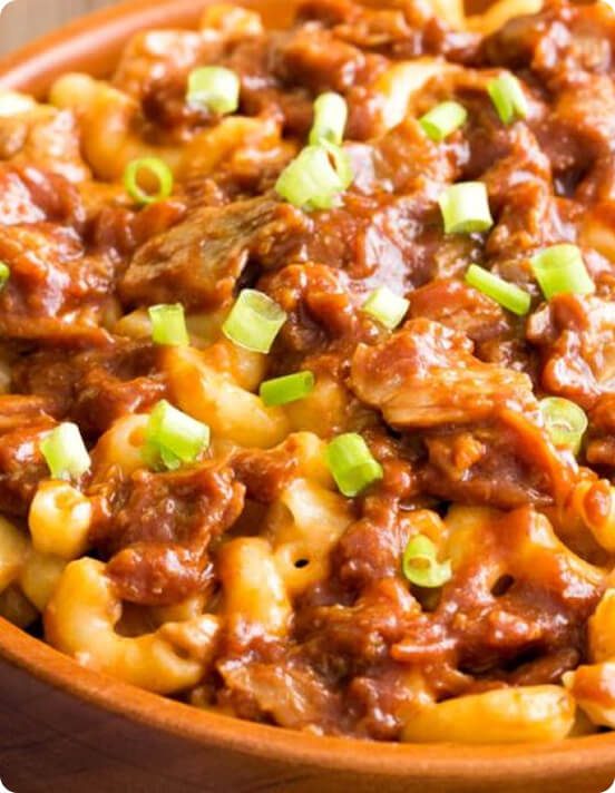 Green Chile Mac, Onion Straws, BBQ Sauce Drizzle, Scallions.