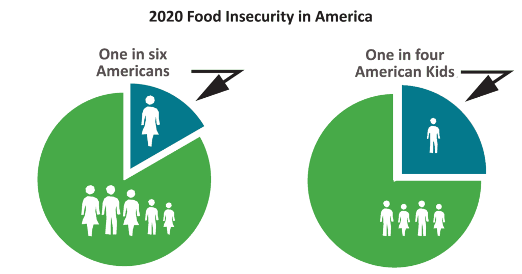 As a result of Covid-related joblessness and skyrocketing unemployment rates driven by the pandemic, the demands on food banks have increased tremendously to rates we have not seen since The Great Depression. It is projected that in 2020 nearly 50 million individuals, equating to 1 in 6 people, including 1 in 4 children, will experience some level of food insecurity.